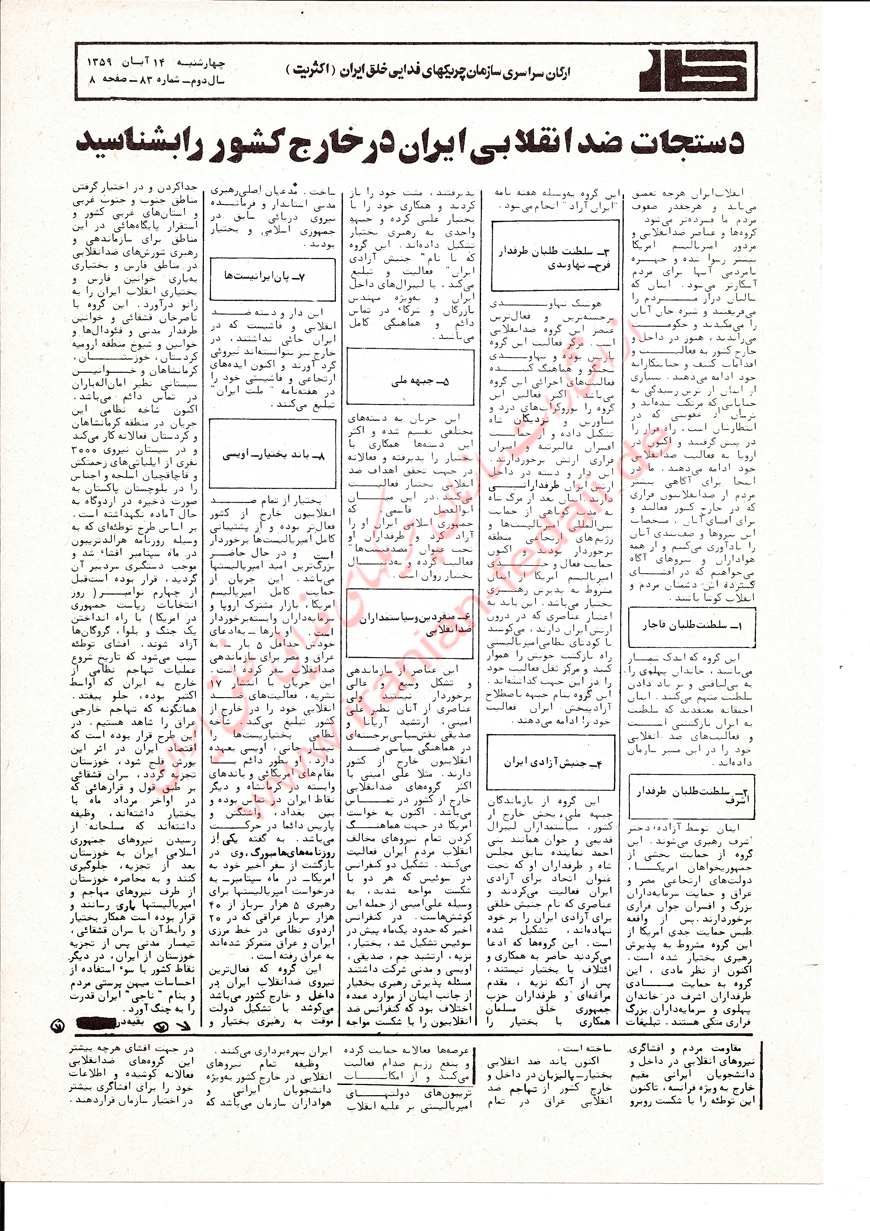 درهنگامه ایکه سازمان اکثریت در داخل ایران اطلاعیه می داد و برای سلامتی آیت الله خمینی دست دعا به آسمان بر داشته بود، این خائنین به مردم ازضدیت و جاسوسی برعلیه نیروهای مخالف رژیم درخارج از کشور نیزغافل نبودند. در آن زمان آنها دوش بدوش برادران حزب الهی و تبهکاران رژیم متشکل در سفارتخانه ها برعلیه تمامی مخالفین جمهوری اسلامی ایران فعال بودند. سند زیر حاصل تلاش این مزدوران و جمع بندی آنها در سال ۱۳۵۹ می باشد